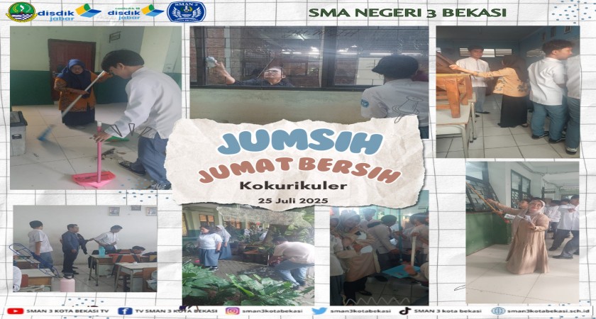 (Bekasi, 25 Juli 2025). SMA Negeri 3 Bekasi mengadakan kegiatan jumat bersih untuk membersihkan lingkungan sekolah. Kegiatan ini diikuti oleh seluruh warga sekolah. Semua peserta didik membersihkan kelasnya masing-masing di bawah bimbingan guru dan wali kelas. Sebagian peserta didik juga diminta untuk membersihkan ruangan lain yang ada di sekolah. Jumat bersih ini dilakukan secara bersama-sama dan penuh rasa tanggung jawab.