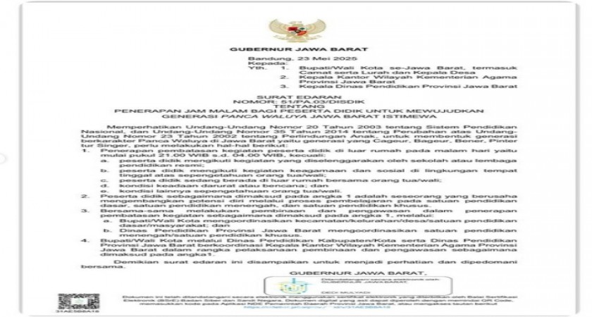 Penerapan jam malam bagi peserta didik untuk mewujudkan Generasi Panca Waluya Jawa Barat Istimewa