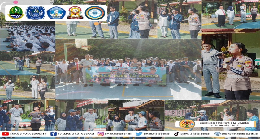 (Bekasi, 10 November 2025). Telah dilaksanakan sosialisasi tertib lalu lintas oleh Satbinmas Polres Blora bertempat di lapangan SMA Negeri 3 Bekasi dan diikuti oleh warga sekolah. Materi keselamatan berlalulintas disampaikan oleh Aipda Ayu dari Polresta Bekasi bersama Jasa Raharja. Kegiatan sosialisasi yang dimulai pukul 07.40 membahas berbagai hal meliputi apa itu lalu lintas, ruang lalu lintas, rambu-rambu, marka, APIL (Alat Pemberi Isyarat Lalu Lintas), cara permohonan SIM, penyelesaian prosedur bila ditilang, hingga tips selamat di jalan.